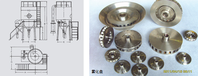 空氣經(jīng)過濾和加熱,進入干燥器頂部空氣分配器,熱空氣呈螺旋狀均勻地進入干燥室。料液經(jīng)塔體頂部的高速離心霧化器,(旋轉(zhuǎn))噴霧成極細(xì)微的霧狀液珠,與熱空氣并流接觸在極短的時間內(nèi)可干燥為成品。成品連續(xù)地由干燥塔底部和旋風(fēng)分離器中輸出,廢氣由風(fēng)機排空。