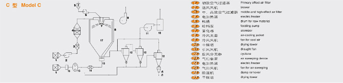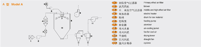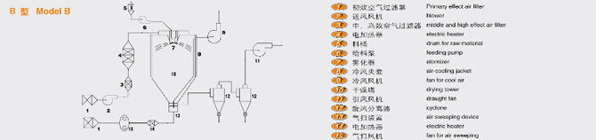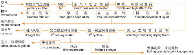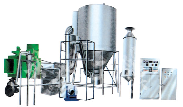 該機采用全封閉形式,所有部件均采用不銹鋼制造,配有三級凈化裝置,過濾后的空氣達十萬級要求。筒體與頂部裝有冷壁裝置,使壁溫<80℃,干燥塔內(nèi)裝有氣刷掃塔裝置。經(jīng)該機干燥后的中藥浸膏粉,不會出現(xiàn)焦化變質(zhì)現(xiàn)象,大大增加了收粉率(95%以上),而且不會產(chǎn)生混藥現(xiàn)象和粘壁現(xiàn)象。