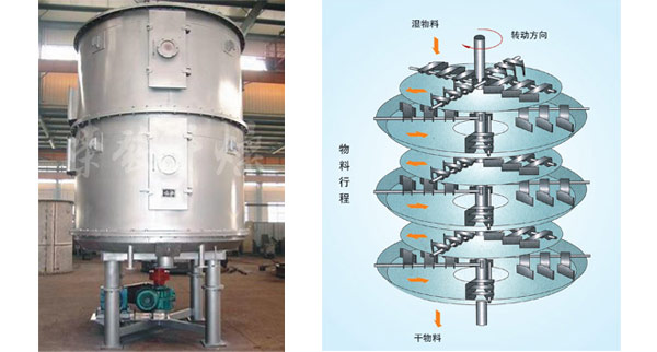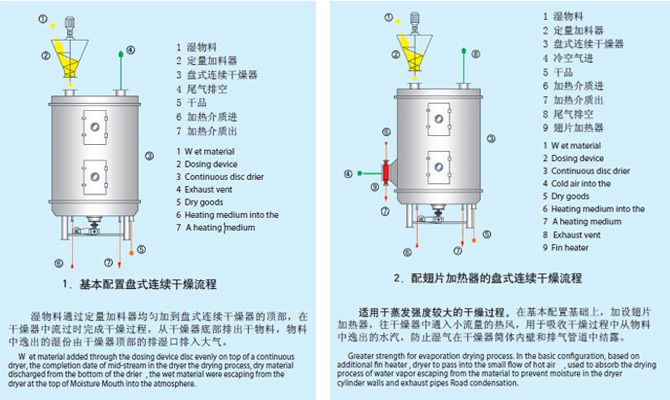 濕物料自加料器連續(xù)地加到干燥器上部第一層干燥盤上,帶有耙葉的耙臂作回轉(zhuǎn)運動使耙臂作回轉(zhuǎn)運動使耙葉連續(xù)地翻抄物料。物料沿指數(shù)螺旋線流過干燥盤表面,在小干燥盤上的物料被移送到外緣,并在外緣落到下方的大干燥盤外緣,在大干盤上物料向里移動并從中間落料口落如下一層小干燥盤中。大小干燥盤上下交替排列,物料得以連續(xù)地流過整個干燥器。中空的干燥盤內(nèi)通入加熱介質(zhì),加熱介質(zhì)形式有飽和蒸汽、熱水和導(dǎo)熱油,加熱介質(zhì)由干燥盤的一端進入,從另一端導(dǎo)出。已干物料從^后一層干燥盤落到殼體的底層,^后被耙葉移送到出料口排出。濕份從物料中逸出,由設(shè)在頂蓋上的排濕口排出,真空型盤式干燥器的濕氣由設(shè)在頂蓋上的真空泵口排出。從底層排出的干物料可直接包裝。通過配加翅片加熱器、溶劑回收冷凝器、袋式除塵器、干料返混機構(gòu)、引風(fēng)機等輔機,可提高其干燥的生產(chǎn)能力,干燥膏糊狀和熱敏性物 料,可方便地回收溶劑,并能進行熱解和反應(yīng)操作。