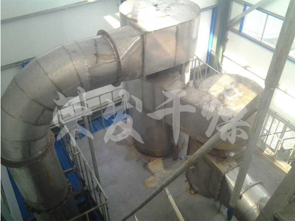 空氣經(jīng)過濾和加熱,進(jìn)入干燥器頂部空氣分配器,熱空氣呈螺旋狀均勻地進(jìn)入干燥室。料液經(jīng)塔體頂部的高速離心霧化器,(旋轉(zhuǎn))噴霧成極細(xì)微的霧狀液珠,與熱空氣并流接觸在極短的時(shí)間內(nèi)可干燥為成品。成品連續(xù)地由干燥塔底部和旋風(fēng)分離器中輸出,廢氣由風(fēng)機(jī)排空。